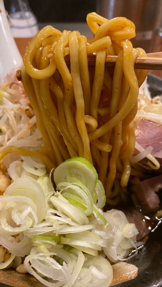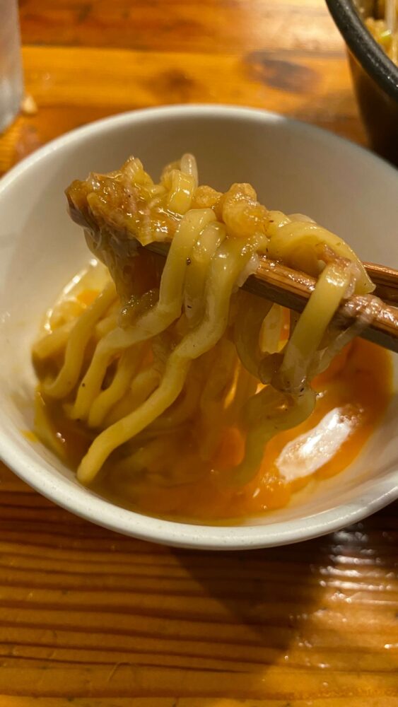 準備ができて麺をすすると、これがツルモチな食感、かつ濃いめなタレが絡んでめっちゃ旨いです!