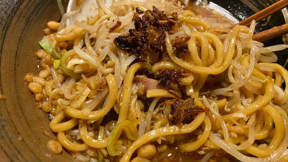 ただ、一般的な二郎系と比べると、かつお節等で魚介風味も感じるためか、上品なテイストですね。