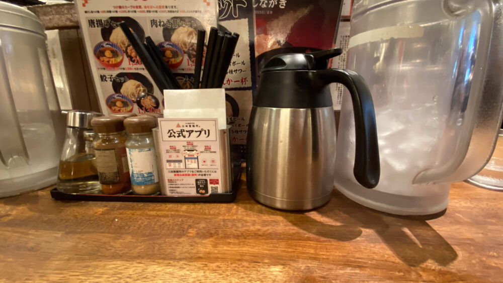 ▲卓上調味料はお酢の他、にんにく七味などの粉末調味料が4種類ほど。