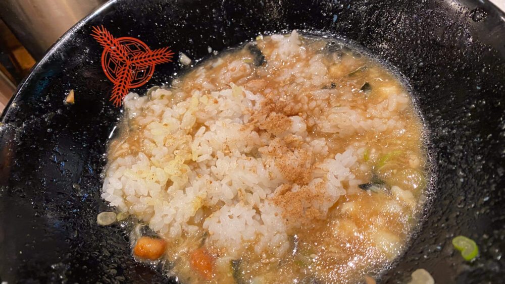 ▲麺を食べ終えたら、たくあん飯のご飯部分を残ったタレへ投入。魚粉も入っているのが嬉しいポイント。