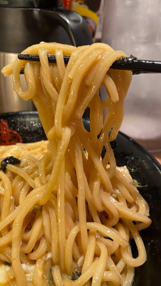 ▲ニンニク醤油ダレががっつり絡んだモチモチ麺が美味!