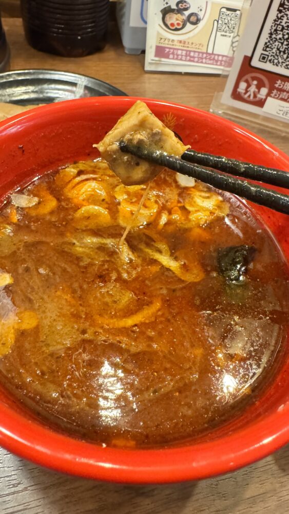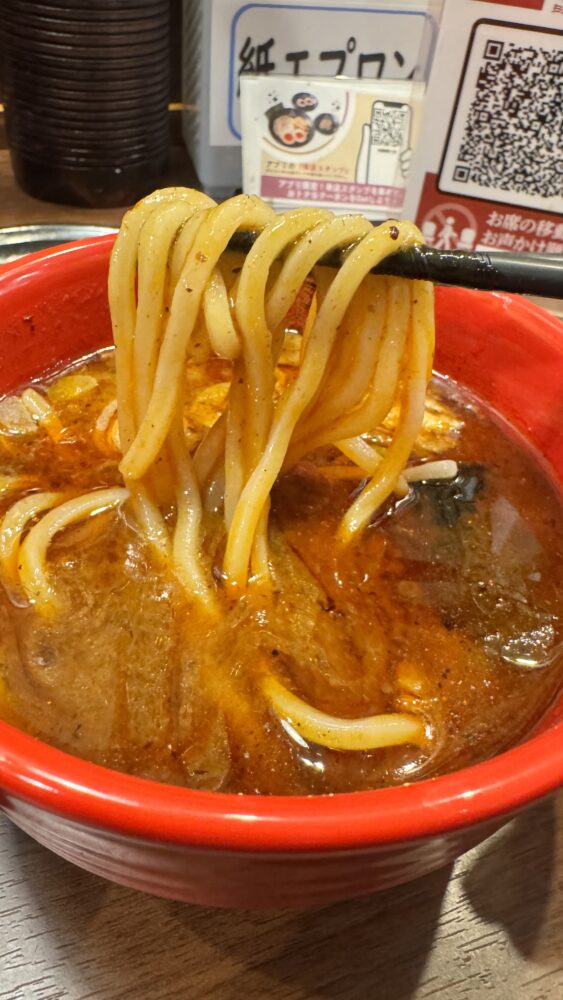 ▲つけ汁は、濃厚でラー油的な辛さが効いた辛旨タイプ。どろりと粘度も高め。