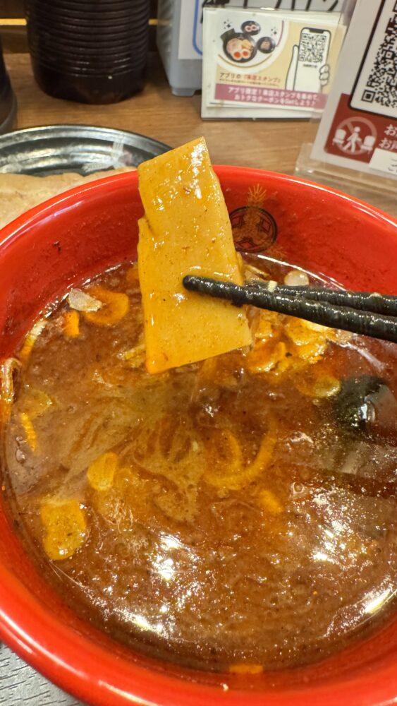 ▲メンマは幅広ですが薄め。辛旨なつけ汁に浸っているのでパンチあります。