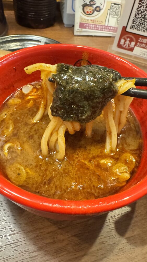 ▲麺をつけ汁に投入。モチっと食感の麺に辛旨で濃厚なつけ汁がたっぷり絡んでめちゃ旨。