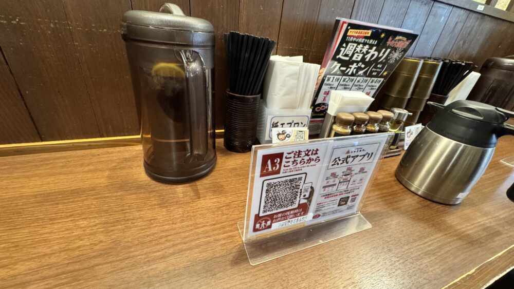 ▲各席にQRコードが設置。卓上調味料は鰹塩、三味唐辛子、にんにく七味、黒胡椒、スパイス(お酢)など。
