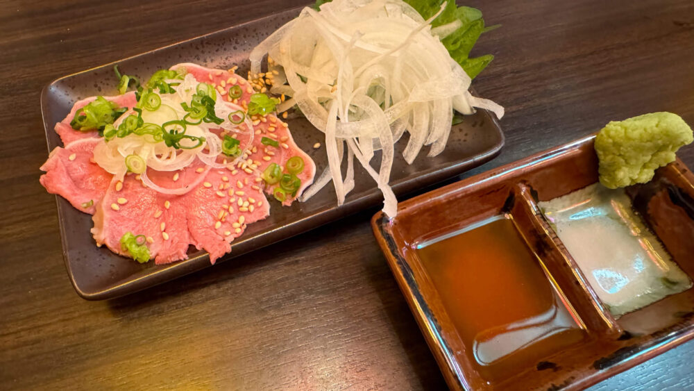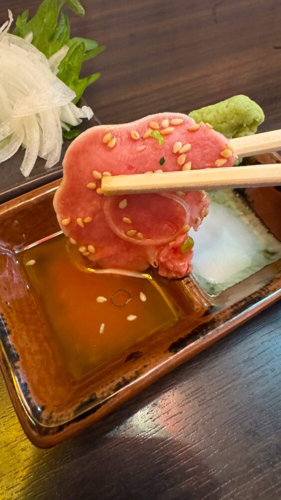 ▲ごま油の効いたタレにつけて食べるたん刺しは、ほどよくコリっとした食感があって美味!