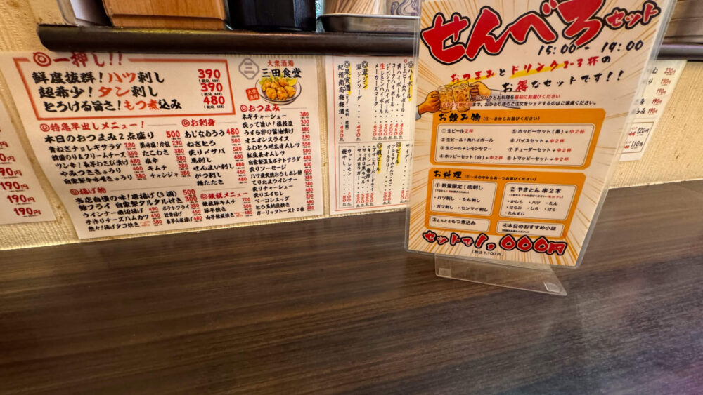 ▲レギュラーメニュー(左)の他、せんべろセットのメニュー(右)があります。