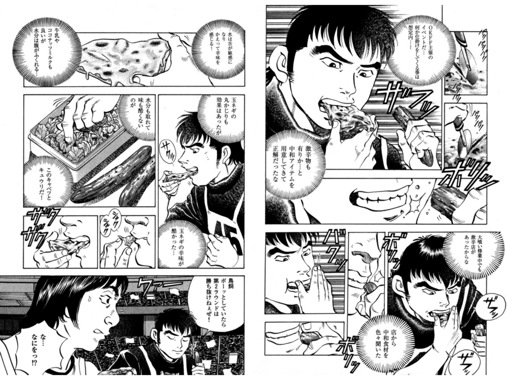 私が大食いする際に参考にしているマンガ「喰いしん坊!」でも激辛対策で以下のような場面があります。