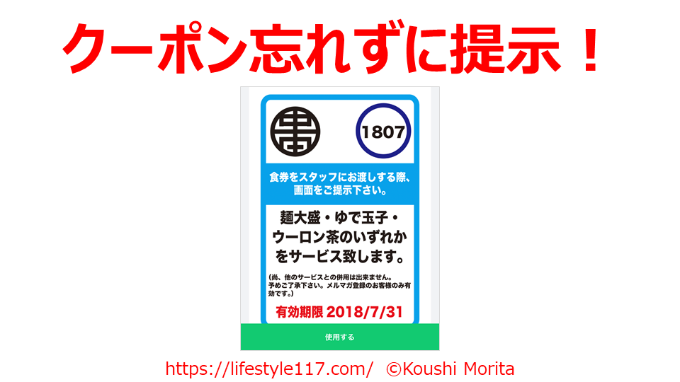 その際、第1条でせっかくGETしたクーポンをしっかりと提示して使いましょう。