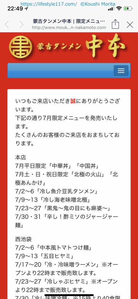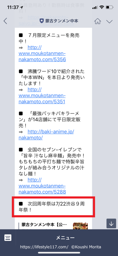 中本は店舗ごとの期間限定メニューや、何かの作品や番組などのコラボメニューなど、公式LINEで告知されますよ。