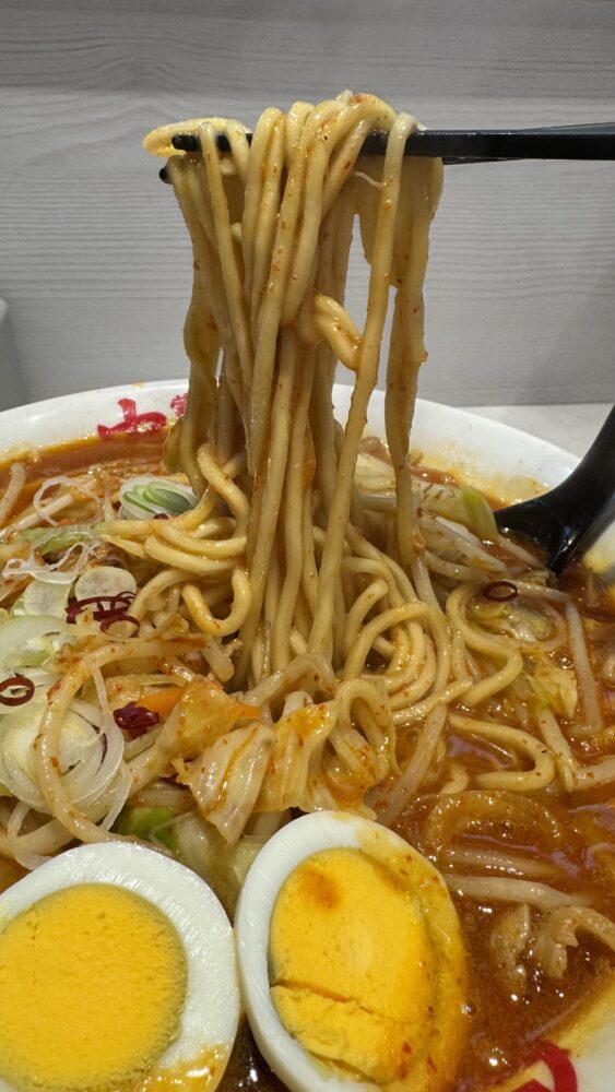 ▲麺はストレートでモチっと食感。辛旨な北極スープが絡んで旨い。終盤はスープを吸ってデロ気味になるのも良き。
