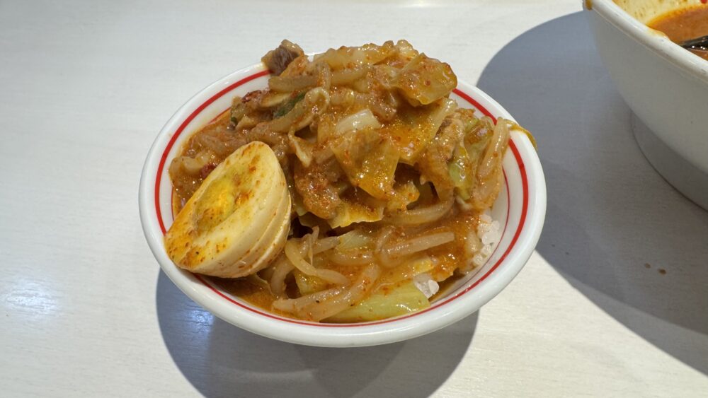 ▲麺を食べ終えたら、残った具材とスープをプチライスへ投入。野菜と玉子がたっぷりで豪華。