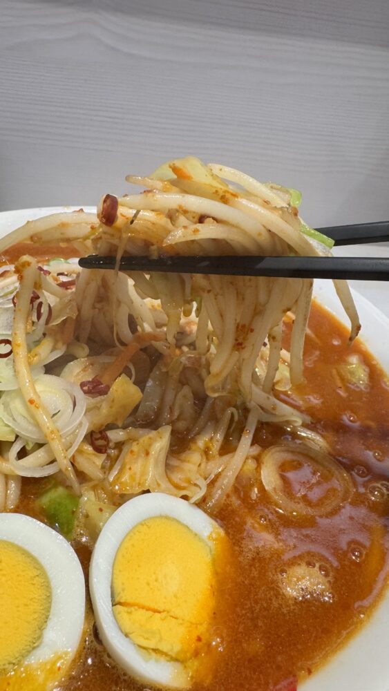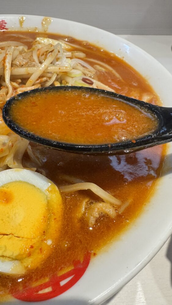▲スープは、豚骨ベースの北極。辛さ10なのに不思議とそこまで感じないほど。まろやかな辛旨。