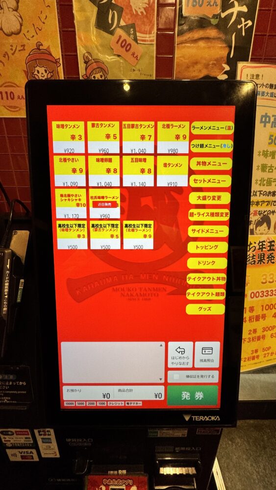 このタイミングで蒙古タンメン中本のアプリを見せ、ポイントをためてもらう+使いたいクーポンを申告すると良いです。