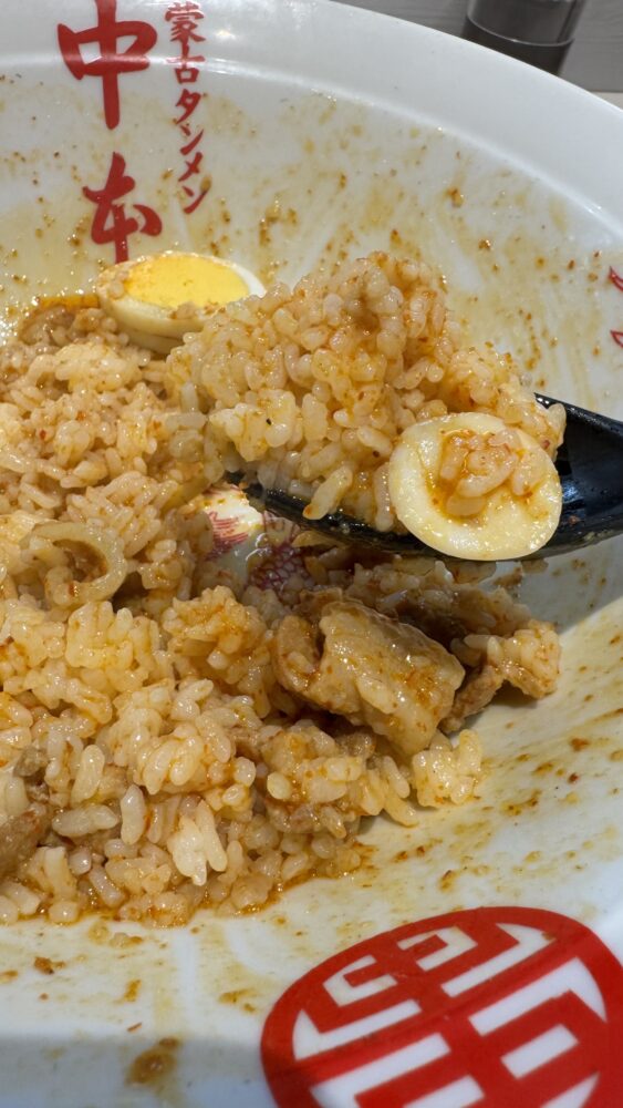 ▲麺を食べ終えたら、丼へライスを投入。北極のタレ・背脂・バターの旨味をまとったライスが旨い。