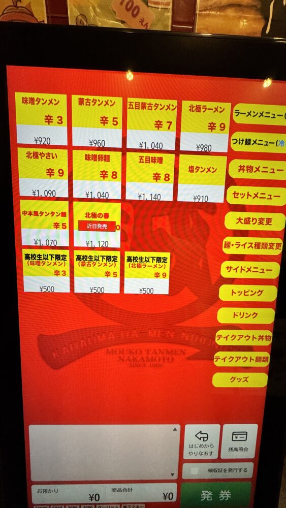このタイミングで蒙古タンメン中本のアプリを見せ、ポイントをためてもらう+使いたいクーポンを申告すると良いです。