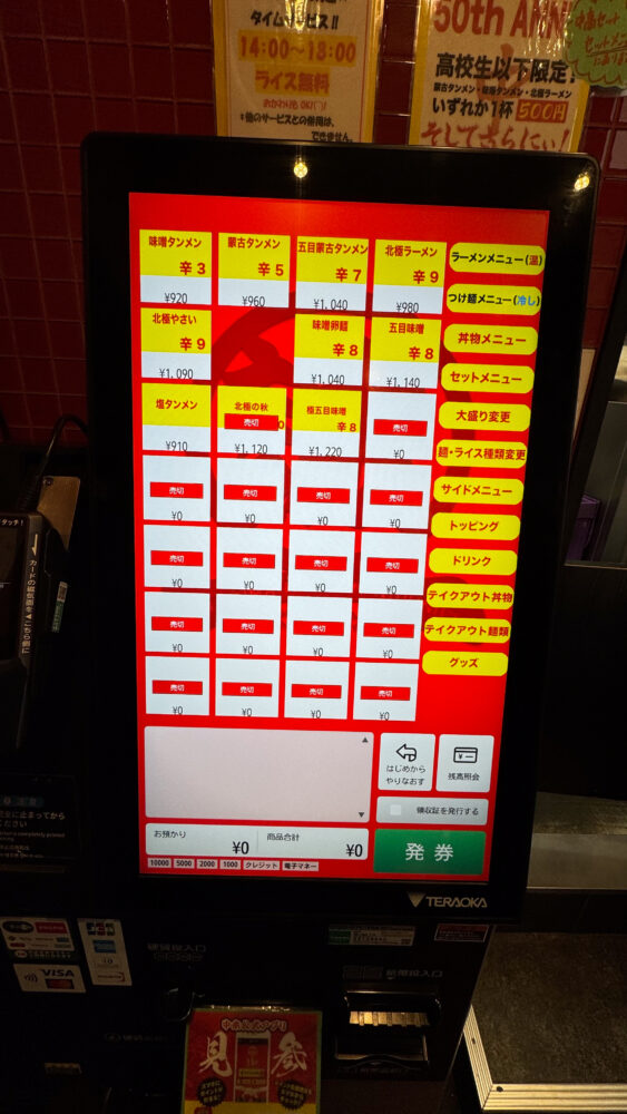 ▲食券機で注文します。リニューアルされて交通系ICやクレジット決済も対応になって嬉しい。