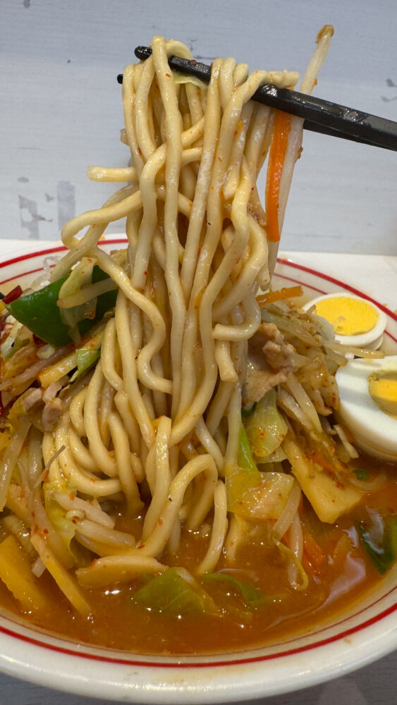▲中本の中太ストレート麺。辛旨なスープをまとって旨い。