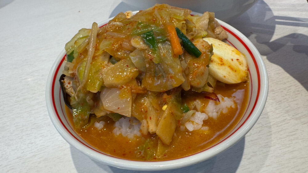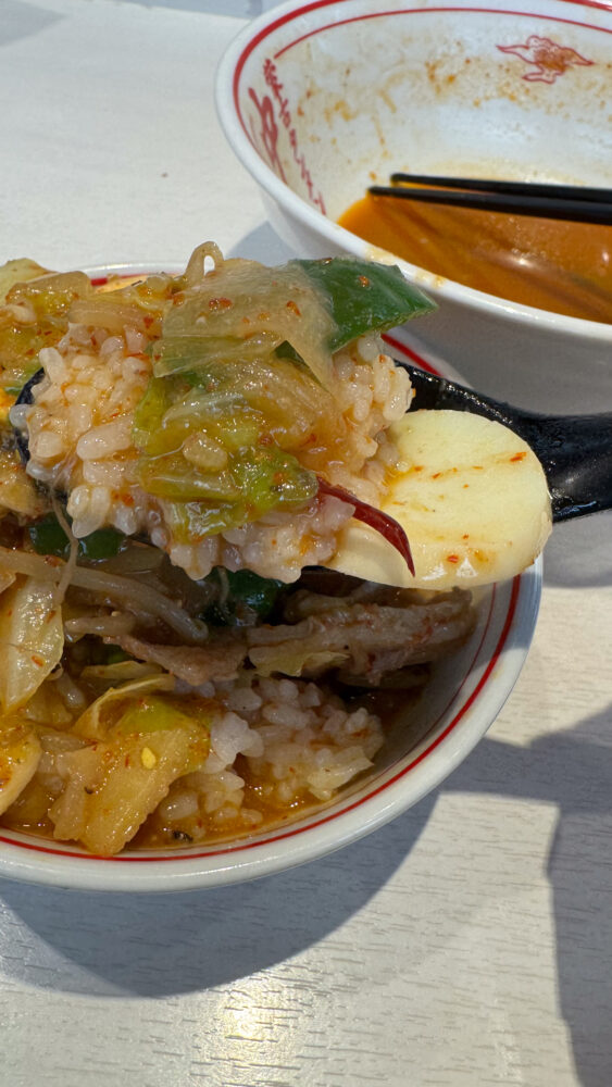 ▲麺を食べ終えたら、ライスへ残った具材とスープを投入。具材が多いメニューだと豪華な丼になりますね。
