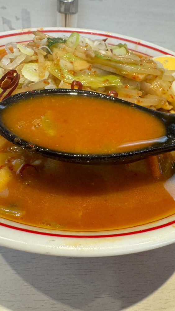 ▲スープは、豚骨べ―スなのでクリーミー。通常の五目味噌と同じ辛さ8ですが、辛旨の「旨」がより強調された感じで美味。