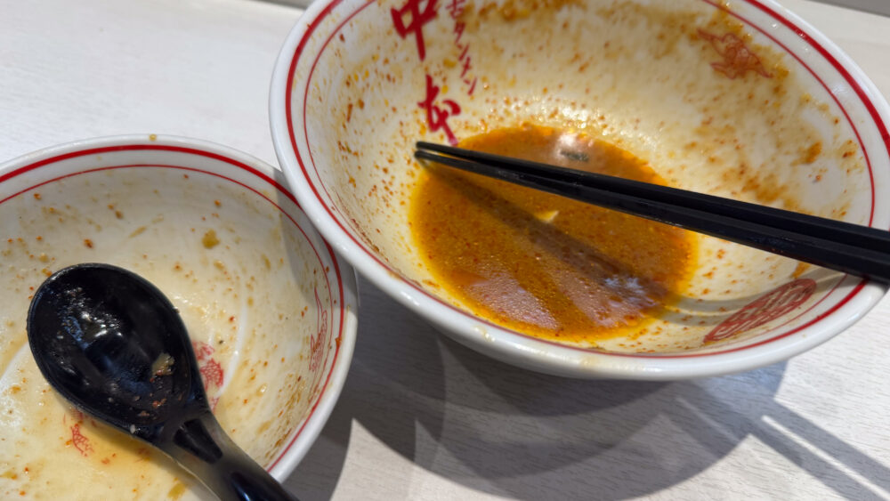 ▲麺を食べ終えたら、残った具材とスープを半ライスへ投入。