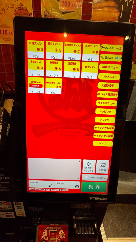 このタイミングで蒙古タンメン中本のアプリを見せ、ポイントをためてもらう+使いたいクーポンを申告すると良いです。