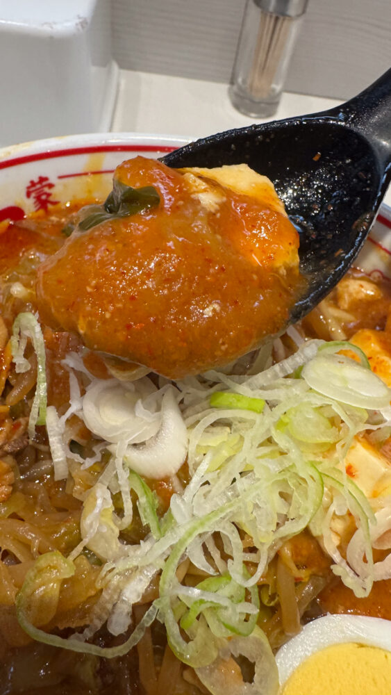 ▲スープは、通常の蒙古タンメンよりやや辛め。麻婆豆腐が溶けた部分で辛味やとろみに変化が出て良き。