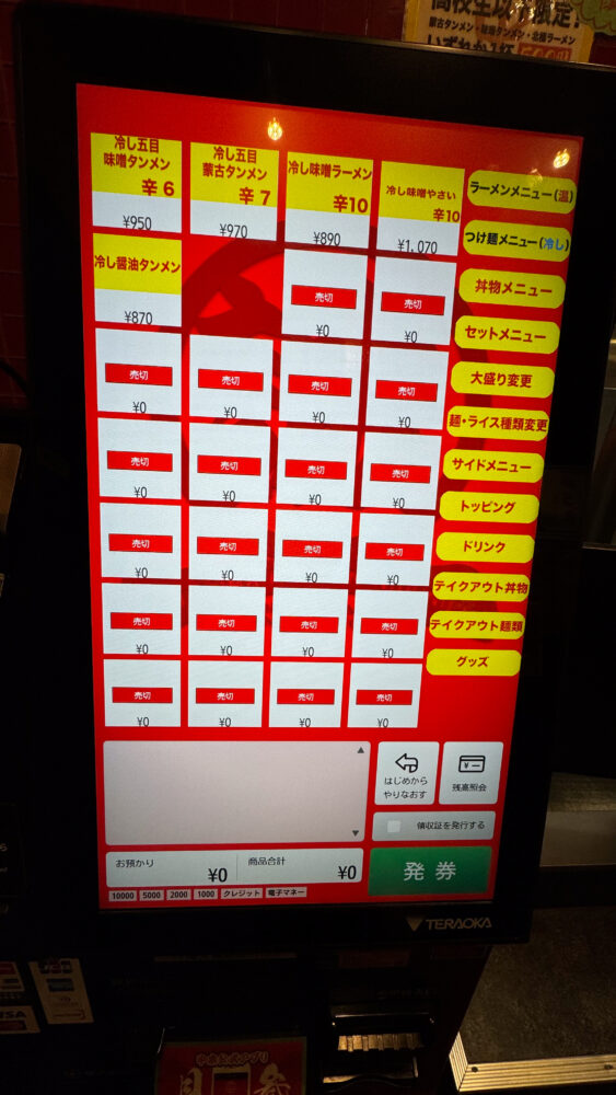 ▲食券機で注文します。リニューアルされて交通系ICやクレジット決済も対応になって嬉しい。