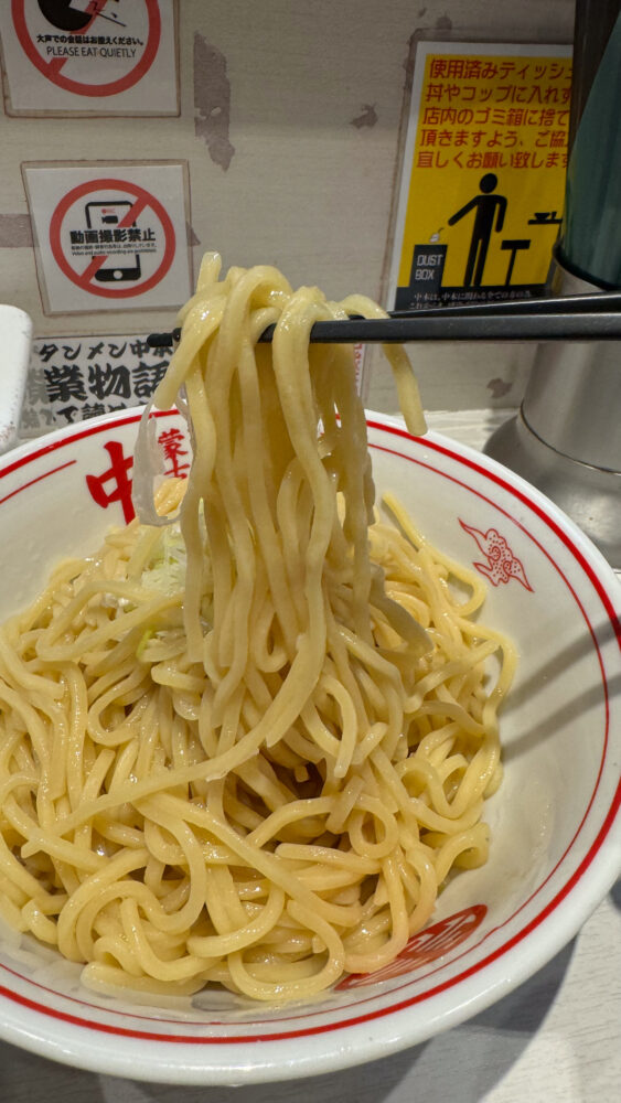 ▲中本の中太ストレート麺。水で締められているのでコシが強め。