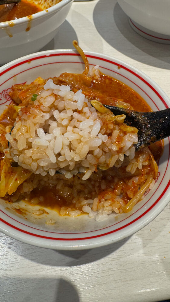 ▲麺を食べ終えたら、ライスへ残った具材とスープを投入。味噌も強めなのでライスとめちゃ合います。