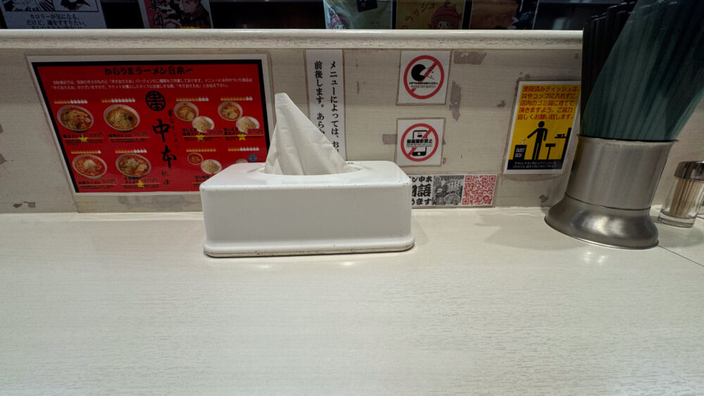 ▲以前はあった卓上調味料はなし。店員さんへお願いすると紅生姜、お酢、一味唐辛子等を持ってきてくれるみたいです。