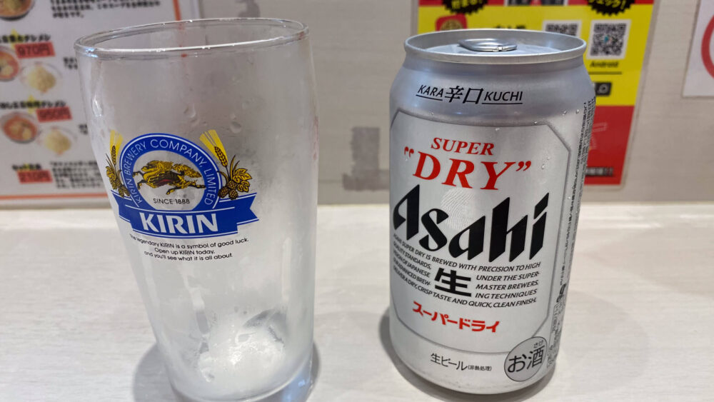 ▲最初に缶ビール(アサヒスーパードライ)から提供。グラス付きなのが嬉しい。