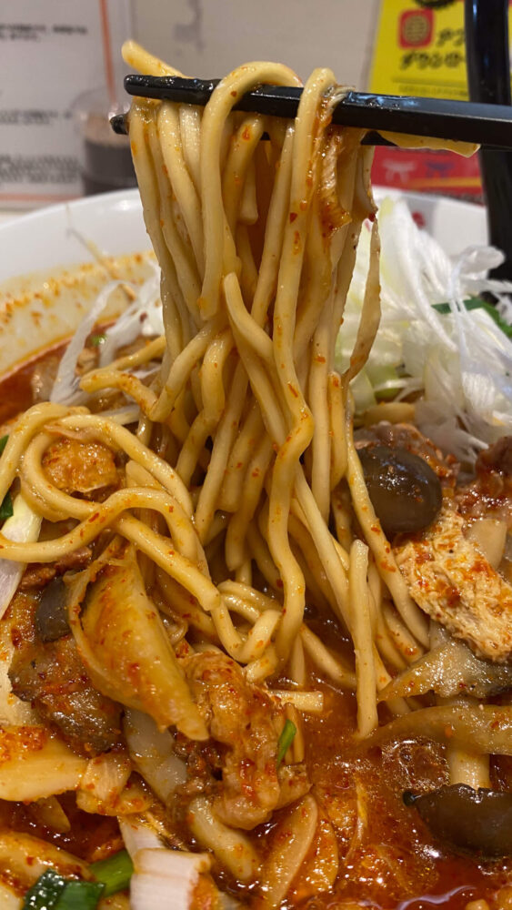 ▲中本ならではの中太麺。北極スープをまとってめちゃ旨。