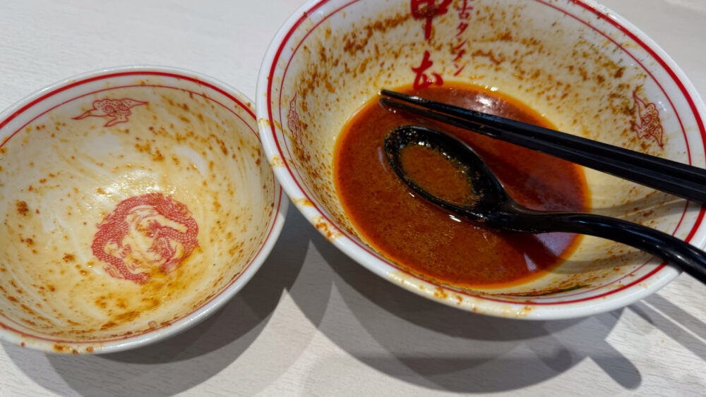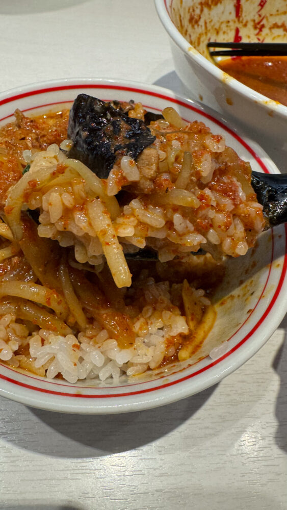 ▲麺を食べ終えたら、半ライスへ残った具材とスープを投入。シビカラ雑炊の完成。