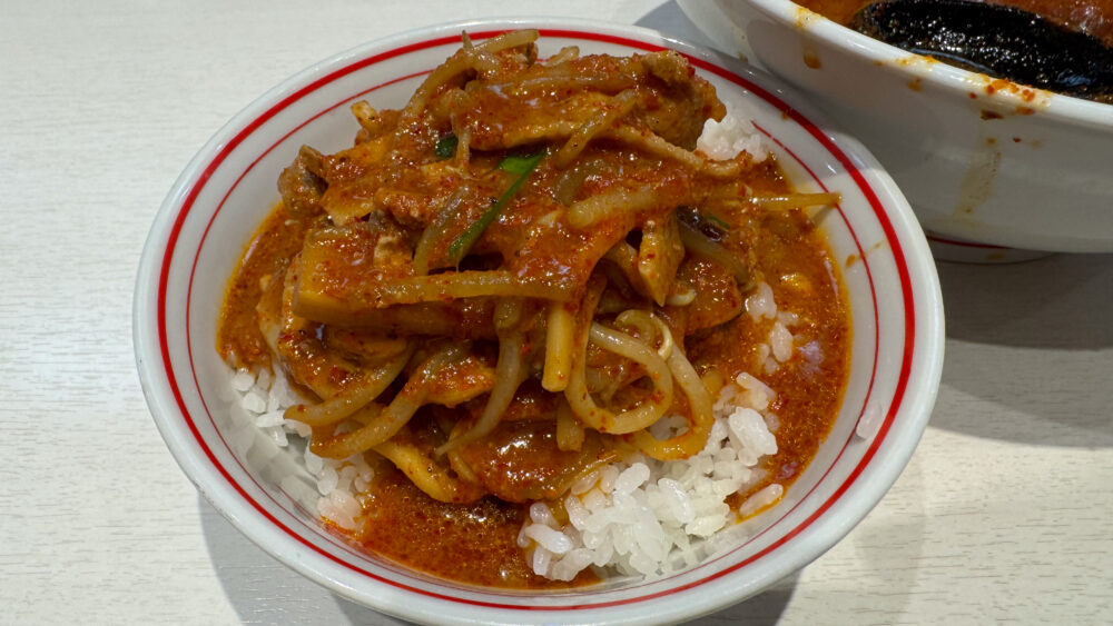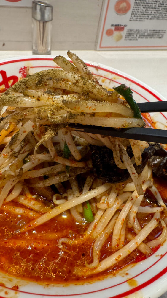 ▲炒められたもやしがシャキシャキで山椒のしびれが加わって辛旨。キクラゲやメンマの食感も良き。