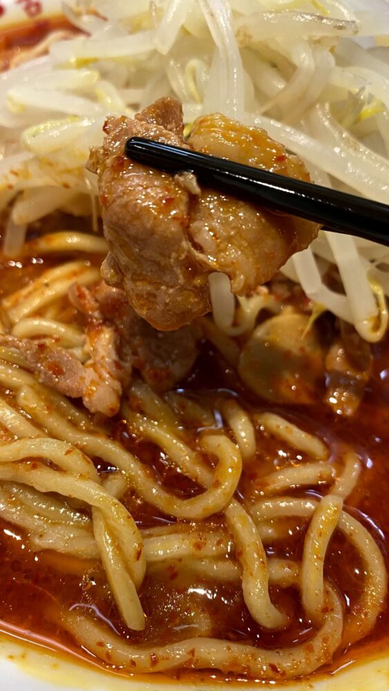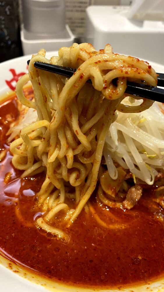 ▲中本ならではの中太麺。唐辛子を良い感じにまとっています。