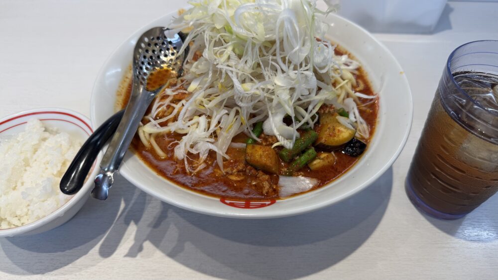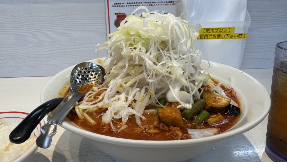 北極の夏は、ネギやもやし、ミンチ、ナス、ニンニクの芽など具沢山で辛旨な一杯でした!