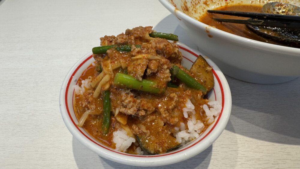 ▲麺を食べ終えたら、残った具材とスープをプチライスへ投入。ミンチとニンニクの芽が気持ち多め。