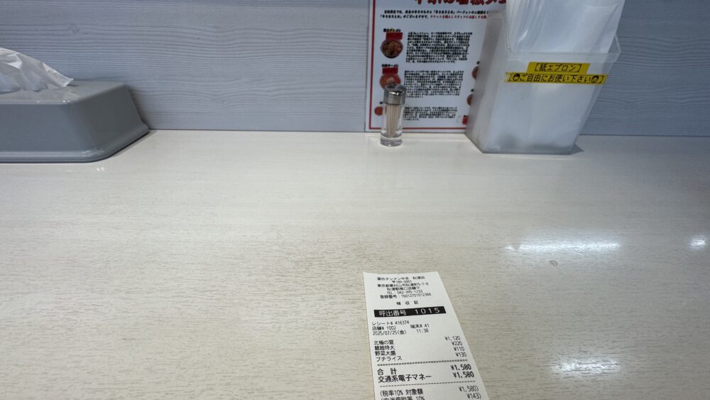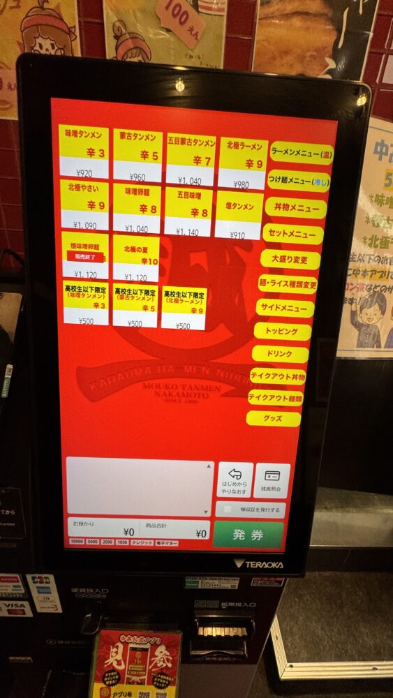 このタイミングで蒙古タンメン中本のアプリを見せ、ポイントをためてもらう+使いたいクーポンを申告すると良いです。