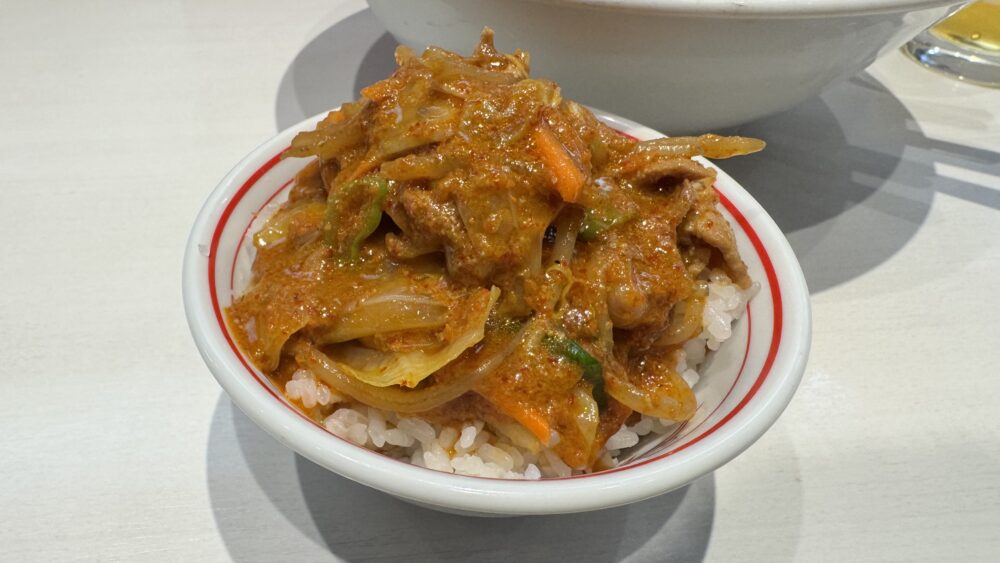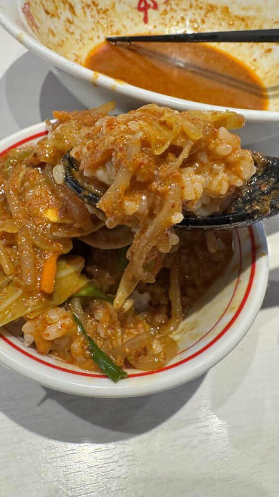▲麺を食べ終えたら、残った具材とスープをプチライスへ投入。野菜と豚肉があると豪華。