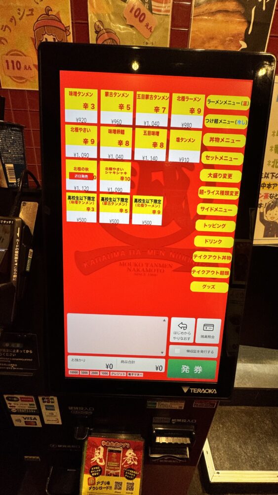 このタイミングで蒙古タンメン中本のアプリを見せ、ポイントをためてもらう+使いたいクーポンを申告すると良いです。