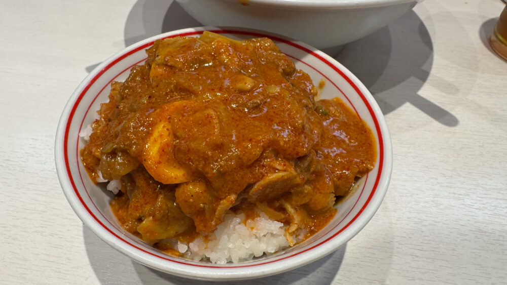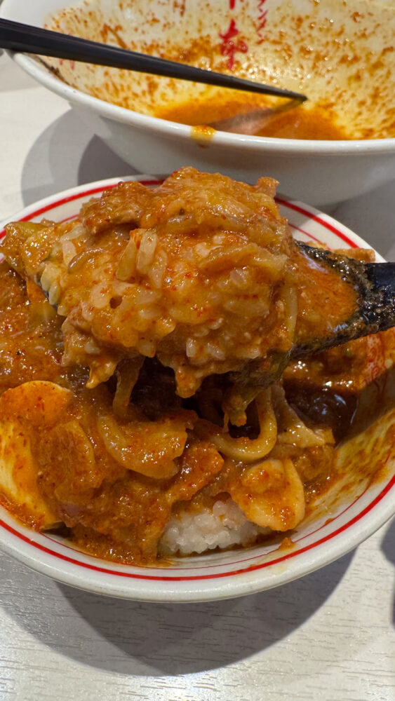▲麺を食べ終えたら、残った具材とスープを半ライスへ投入。北極スープがほぼなくなりました。