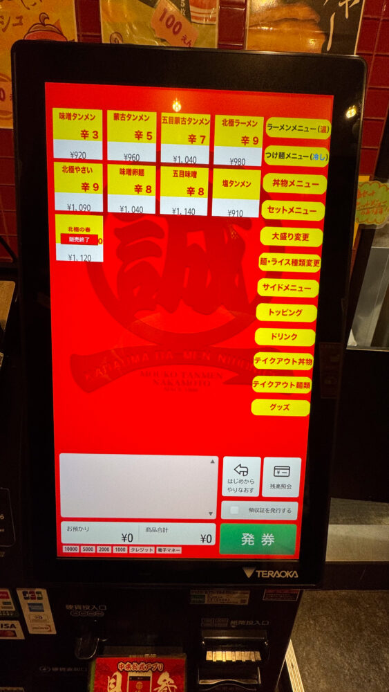 このタイミングで蒙古タンメン中本のアプリを見せ、ポイントをためてもらう+使いたいクーポンを申告すると良いです。