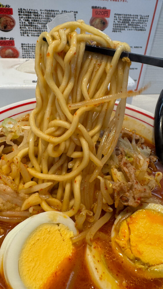 ▲中本の中太ストレート麺。辛味噌スープが絡んで旨い。
