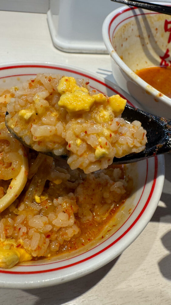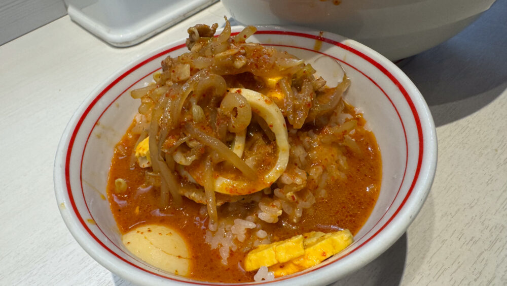▲麺を食べ終えたら、ライスへ残った具材とスープを投入。野菜と玉子をちょっと温存していました。