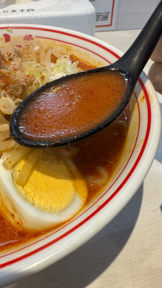 ▲スープは、辛めの味噌。辛さ8なのでしっかりめな辛旨。