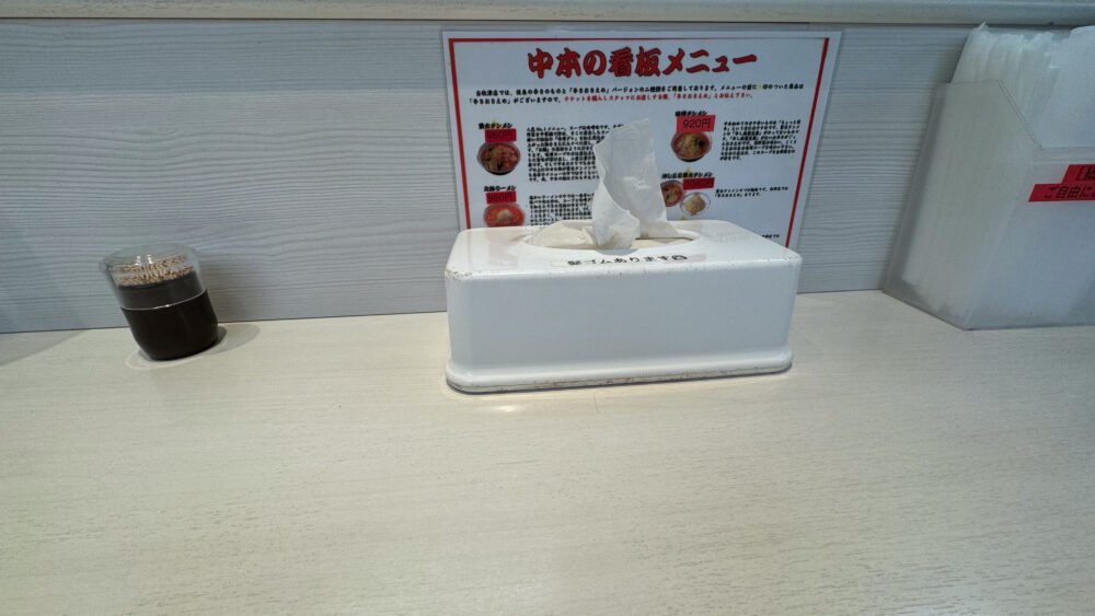▲以前はあった卓上調味料はなし。店員さんへお願いすると紅生姜、お酢、一味唐辛子等を持ってきてくれるみたいです。