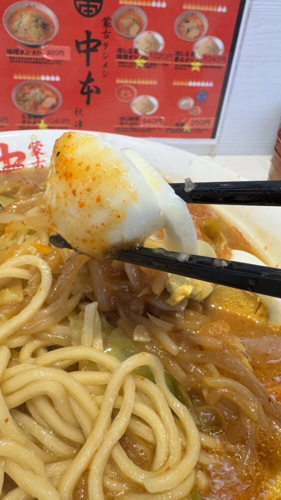 ▲ゆで玉子はしっかりめの茹で加減。玉子のマイルドさが良い味変効果。