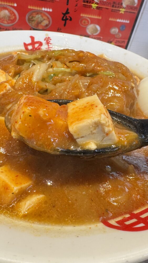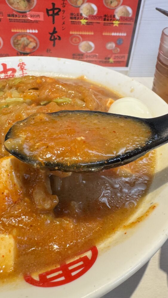 ▲スープはピリ辛な味噌。麻婆餡が入ると、とろみと辛味がレベルアップして美味しい。