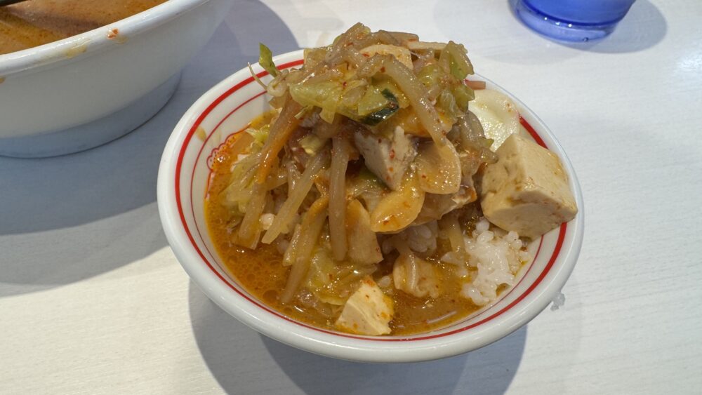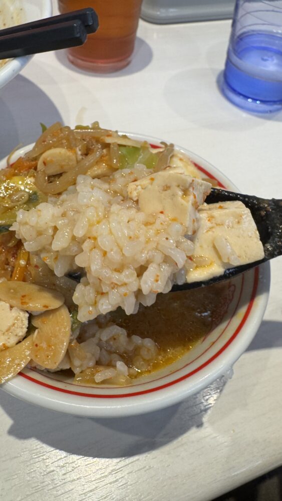 ▲麺を食べ終えたら、残った具材とスープをプチライスへ投入。クタ野菜と豆腐が多め。